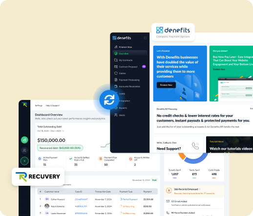 Recuvery x Denefits integration works hand-in-hand, recovering overdue amounts faster without compromising the customer experience. With automated follow-ups and flexible repayment options, Recuvery helps businesses restore cash flow while preserving customer trust. Together with Denefits, you not only ensure smoother finances but also give your customers a valuable opportunity to stay on track while ensuring a better credit standing for them as they make timely monthly payments.
